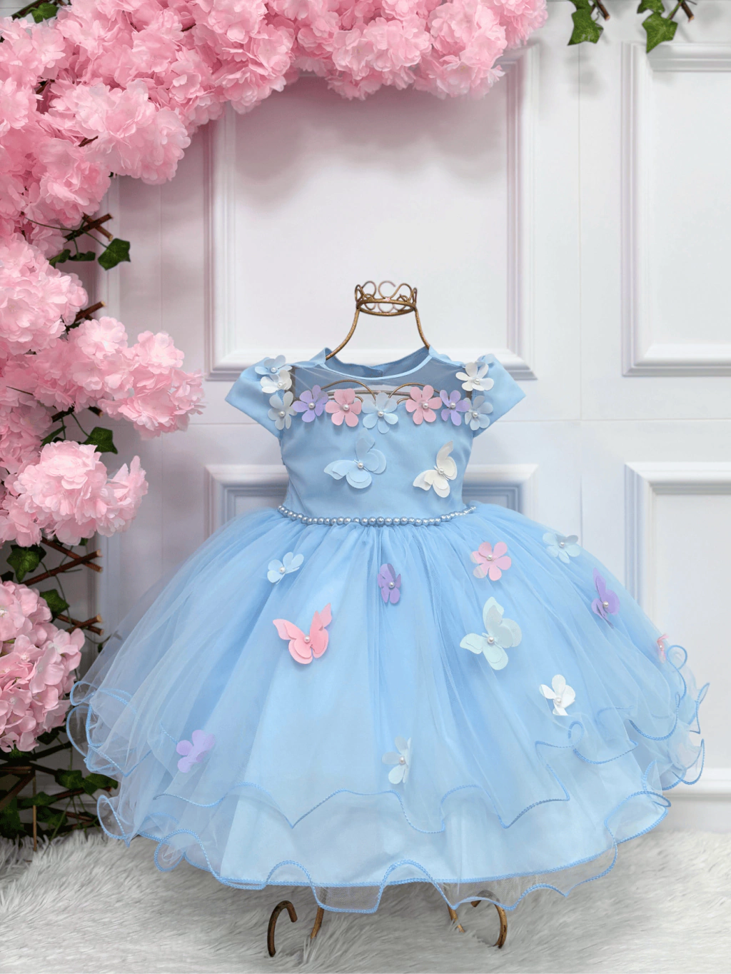 ✨ Apliques 3D de borboletas e flores delicadamente costurados