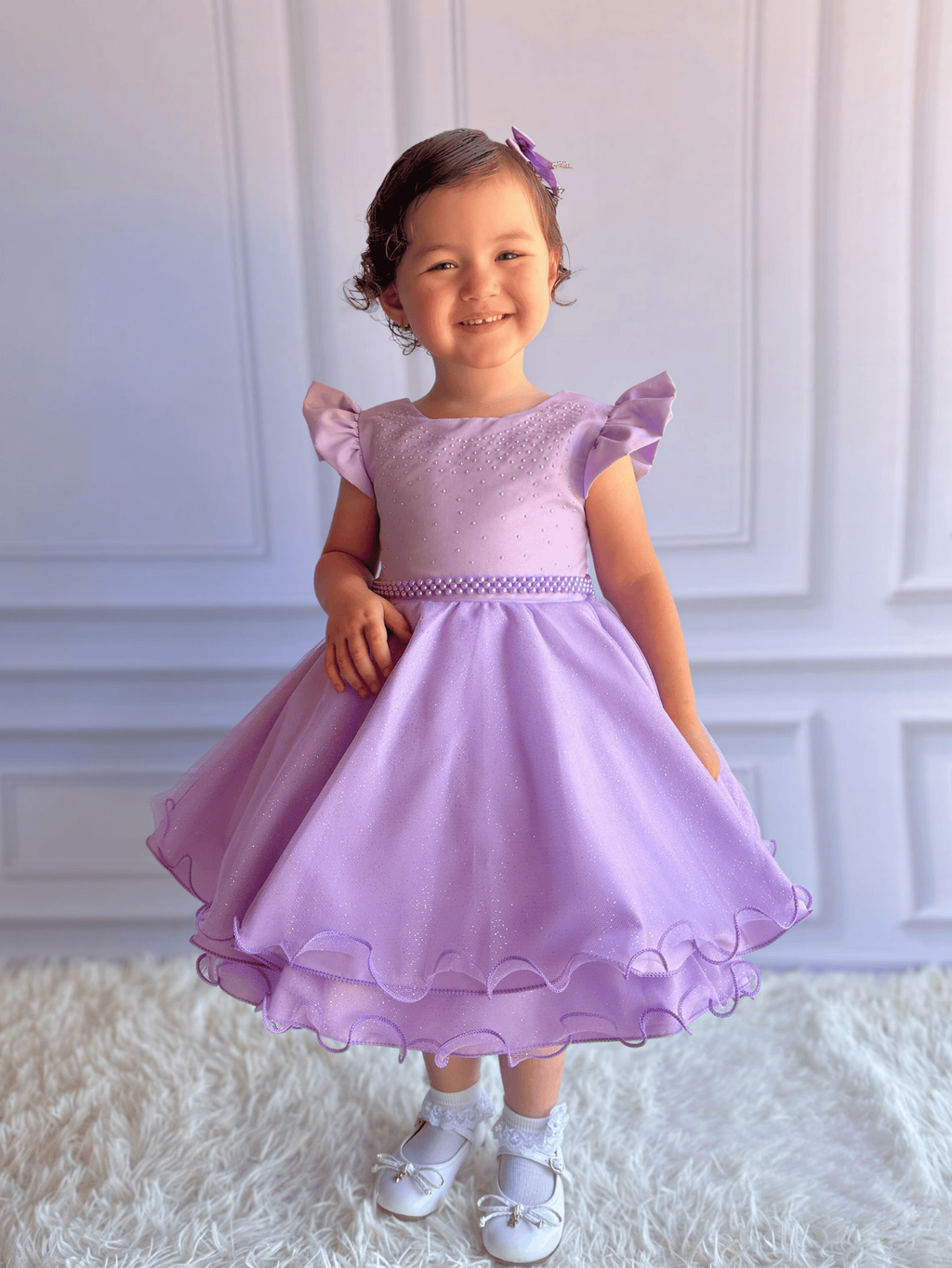 A saia rodada possui um brilho incrível e camadas com acabamento em babados ondulados, conferindo volume e movimento. As manguinhas bufantes em formato de borboleta adicionam leveza e graça. Na parte de trás, um lindo e grande laço complementa o visual, tornando o vestido inesquecível.