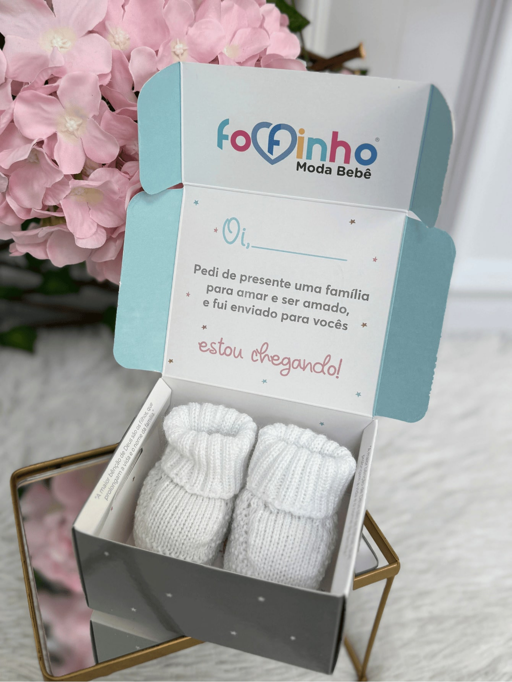 Esse sapatinho de tricô feito à mão é puro aconchego e delicadeza - perfeito para eternizar o anúncio mais esperado da família! Acompanha uma caixinha surpresa encantadora, pronta para emocionar os futuros papais, avós, titios e todos que fazem parte dessa nova história.